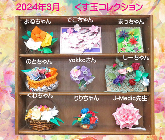 4月のくす玉コレクションは「陽だまり」です。折り紙6枚でできました。皆さん折り紙のサイズいろいろです。カゴやぶら下げる物を使ったり、リリアン、マクラメの糸を使ったり工夫されて飾り付けしてあります。 |
