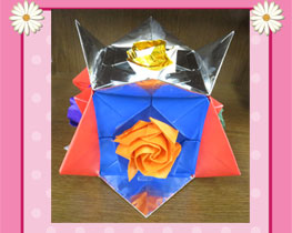 私の作品です。折り方は難しくなかったです。24㎝×24㎝の折り紙6枚を使いました。そのうちの一枚を銀色にしましたアクセントになって良かったと思います。足りない分 先生のバラの花をお借りして飾り付けしました。 |