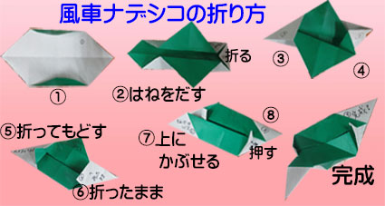左の方は私のお手玉です。緑やピンクの両面の折り紙を使って可愛い花になりました。右の方は折り方です。1パーツが2枚の折り紙でできます。全部で6パーツなので比較的短時間でできました。 |