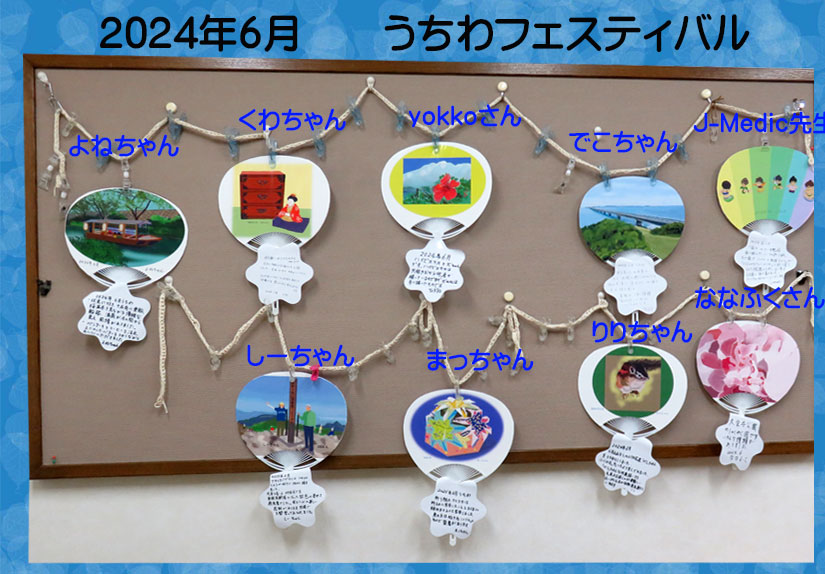 | 2024.06.01 今年もうちわフェスティバルの時期になりました。皆さん早くから今年の題材を決め、いろいろと工夫されています。思い出に残るうちわが掲示板に展示されています。左の方が気に入りました。 |