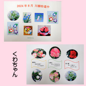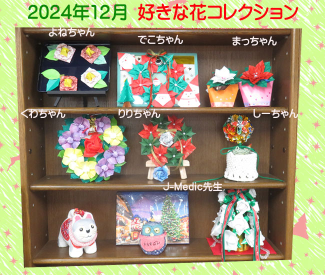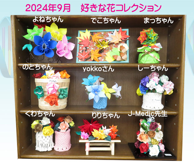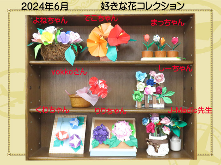 よねちゃん ユリ でこちゃん ハイビスカス まっちゃん チューリップ yokkoさん カーネーション しーちゃん 佐藤ローズ くわちゃん 朝顔りりちゃん 紫陽花 先生、クレマチス、佐藤ローズ。皆さん工夫されて折り華やかに飾り付けしてあります。 |