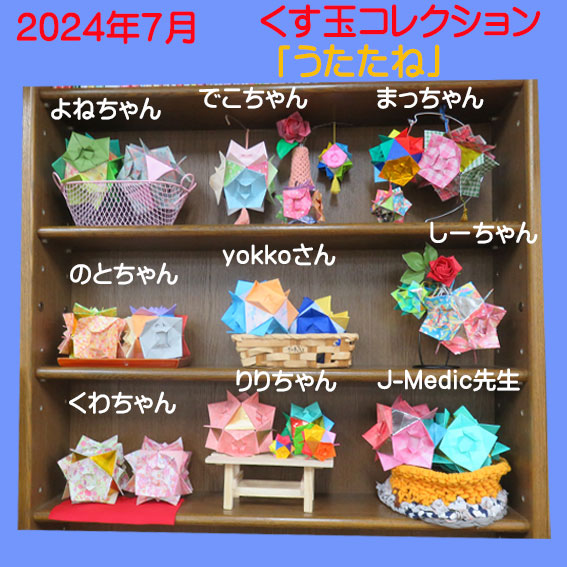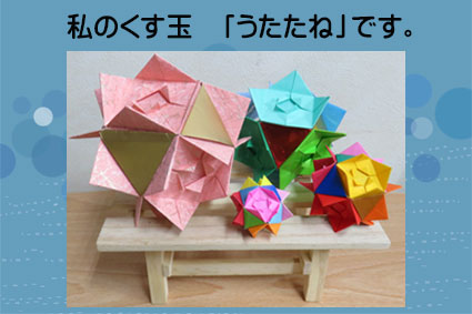 7月のくす玉は「うたたね」です。同じ大きさの折紙で二つの「うたたね」を折られた方、大中小の折り紙を使って「うたたね」を折られた方いろいろです。飾り付けもそれぞれの物を使われて飾り付けしてあります。華やかなくす玉ができています。 |