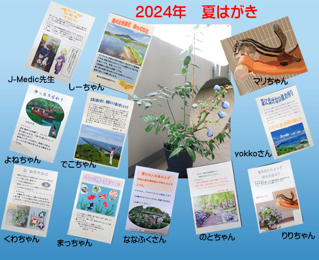 夏はがきが届きました。画像とクリスタ画を合成したはがきに心温まるコメントいただきありがとうございました。マリちゃんはあじさいの花が終わり今はベランダのブルーベリーの実を眺めています。春には花が沢山咲きましたが実になったのは4個だす