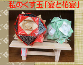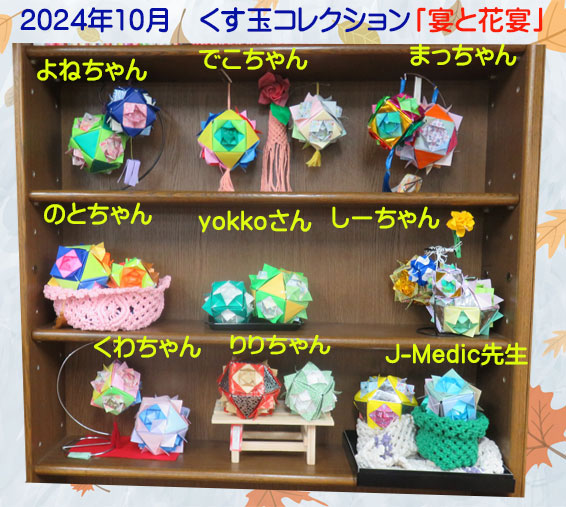10月のくす玉コレクションは「宴と花宴」です。「宴」は折紙6枚を使ってでできています。「花宴」は「宴(うたげ)」に三角つぎてを8枚折り繋ぎます少し大きなくす玉になります。皆さんも折り紙や飾り付けを工夫されています。