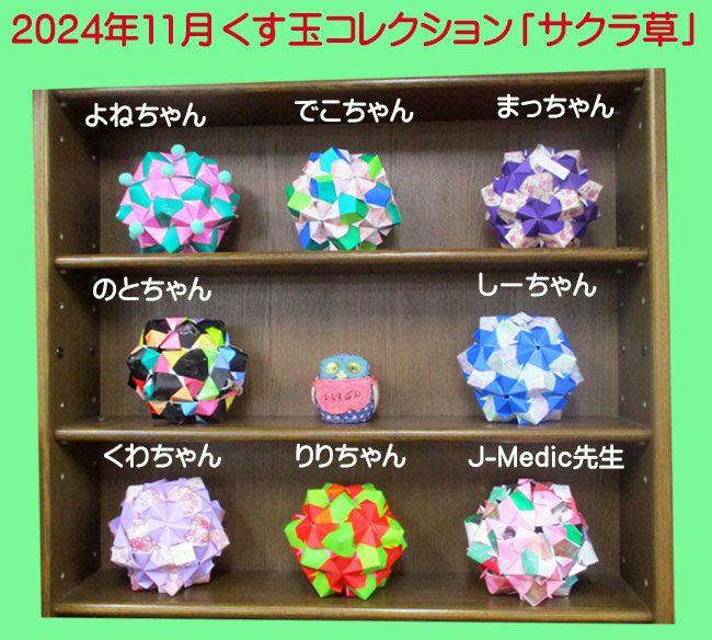 11月のくす玉コレクションはサクラ草です。15㎝×7.5㎝でフェイスとベースを折り30組作り組みます。折り紙の色で大きさが違うようにみえます。華やかなくす玉が並んでいます。 |