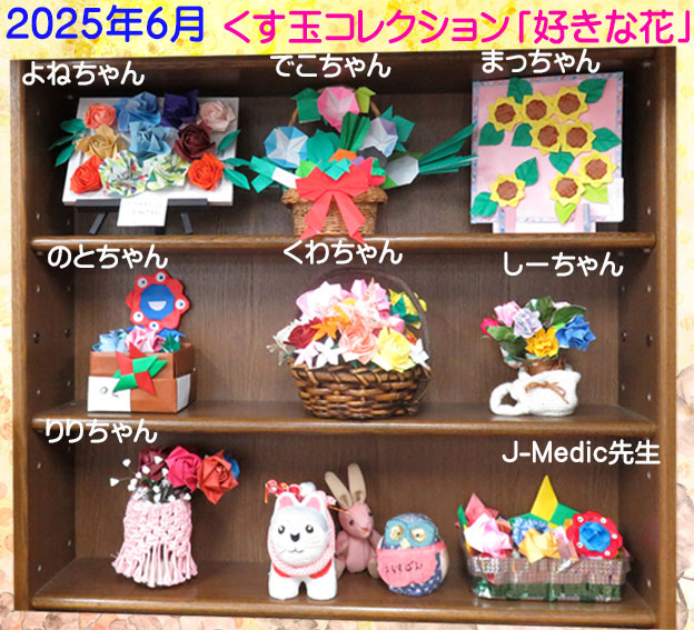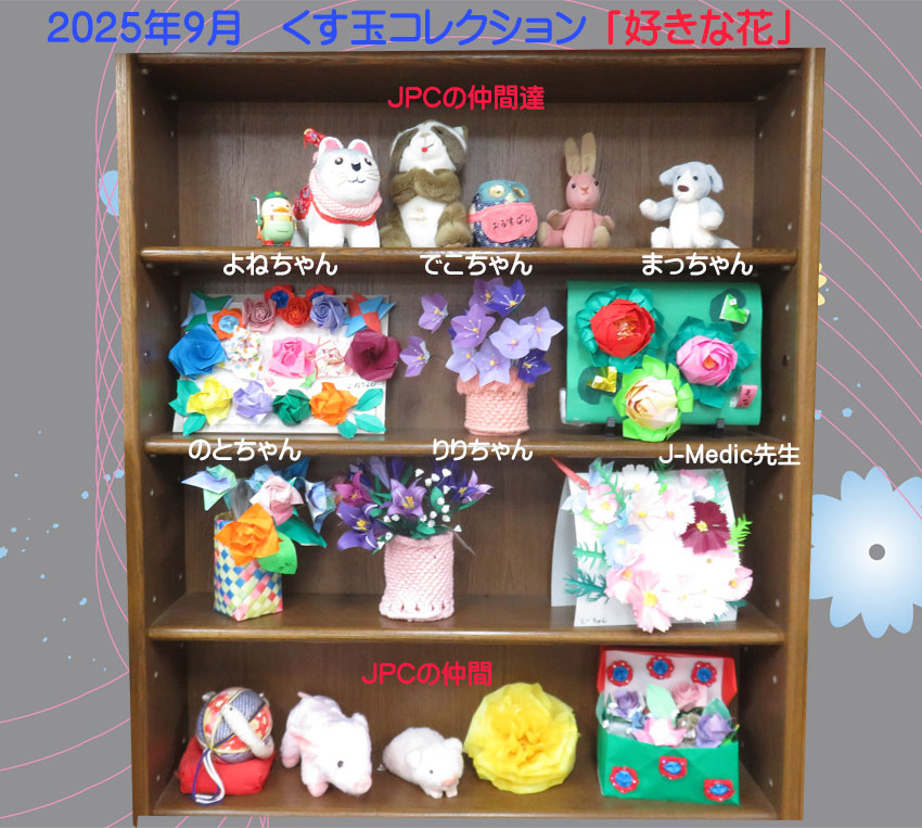 | 2025.09.01 9月は好きな花コレクションです。よねちゃんバラとミャクミャク君のコマ、手裏剣、でこちゃん 桔梗、まっちゃん睡蓮とカエル、のとちゃんバラりりちゃん桔梗 カスミソウ、 しーちゃんコスモス、トンボJ-Medic先生バラとカスミソウ、ミャクミャク君のコマ 工夫されて飾り付けしてあります。JPCの仲間のぬいぐるみさんも綺麗なお花に囲まれて嬉しそうです。 |