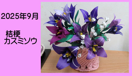 私の好きな花コレクションは桔梗の花をユーチューブをみて三色の折り紙で大小の桔梗を作りました。6月の好きな花コレクションの時に作ったカスミソウを一緒に飾りました。 |