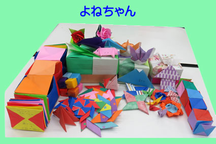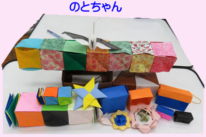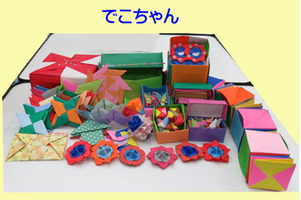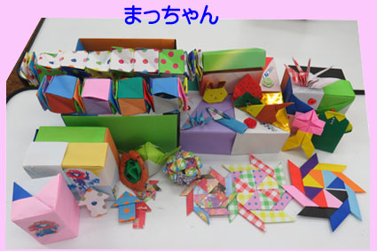 今までに作った箱や小さくした箱に教えていただいた手裏剣、ブックマーカー、くす玉、スパイラルキューブ、ルービックキューブ入れました。小さい折り紙でもたくさん作りました。鶴も小さい箱に入れ、でこちゃんに教わった足を付けた可愛いミャクミャク君作り入れました。 |