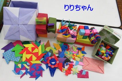 | 大きな箱には長いスパイラルキューブ、手裏剣、ブックマーカー、など折られています。イチゴ、ウサギ、鶴など可愛いのが数多く入れてあります。 |