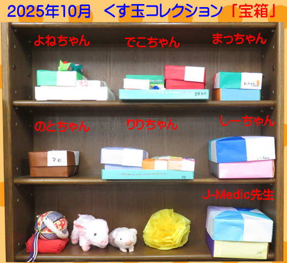 2025.10.01 10月のくす玉コレクションは「宝箱」です。棚に並んでいる箱の中には教えていただいた作品の大小や工夫された作品がたくさん入ってます。 |