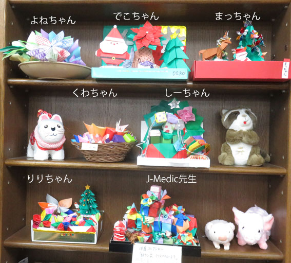 私の作品です。クリスマスムードを出すために折り紙でクリスマスツリーを作りJPCで習った大小のしべつきの花、スリンキー、無限万華鏡、雪だるま、ふたがしっかりした箱などでクリスマスの雰囲気をだしました。 |