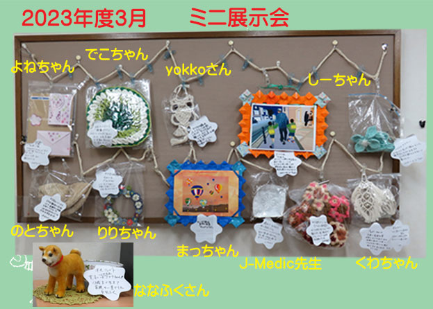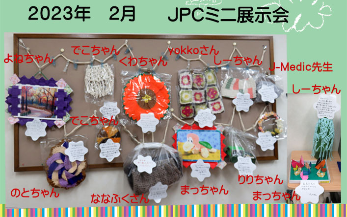 2023年2月のJPCミニ展示会です。寒い日が続きますので今回は編み物作品がたくさん展示されています。マクラメ編み、油絵、クリスタ画、など展示されています。