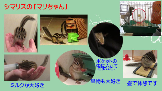 シマリスを飼い始めました。以前何度か飼っていました、夫が3年ほど前からもう一度飼いたいと思っていたようで春になるとペットショップを覗きに行っていました。コロナでなかなか出会えませんでした。今年は生まれて一ヶ月ぐらいのリスがお店にいたので早速買ってきました。手乗りにしたいようで餌はゲージから出してあげています。今はなついています。手や肩などに乗り表情もとても可愛いです。名前はシマリスの中の文字で「マリちゃん」と孫が付けました。 |