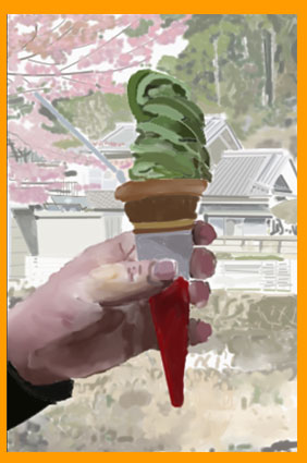 久しぶり奈良県の長谷寺へ行きました。坂を上りお参りをし坂を下りていると疲れたと孫が言ったので休憩しました。私は抹茶のソフトクリームを買いお店の外でイスに座り食べました。田舎を思い出す風景で懐かしくて写真を撮りクリスタ画で描きました。ソフトクリームと風景は思ったより早く描けましたが手を描くのが難しかったです。 |