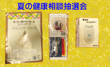 夏の健康相談抽選会で3回しました。手芸用品のコットンポーチ、ちりめんで作るクリスマスの贈り物、ミニ展示会に間に合うように作りたいと思います。