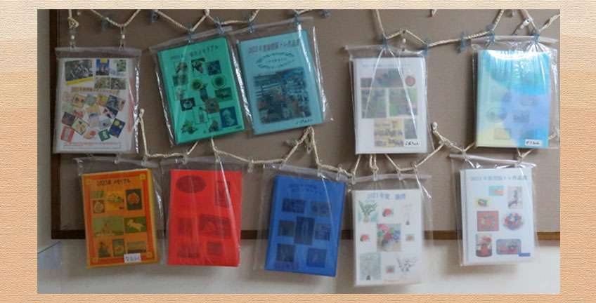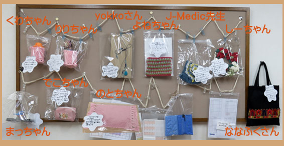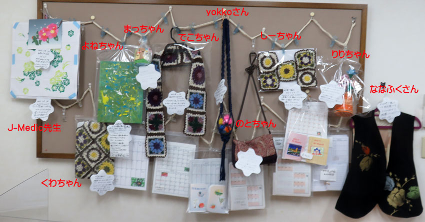 10月度ミニ展示会です。かぎ編み、マクラメ編み、袋物、ブロック、が提示されています。皆さん工夫されて出来上がった作品です。J-Medic先生の手作りのカレンダー、手帳も展示されています。 |