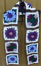 | でこちゃんお花のモチーフつなぎのミニマフラー ペチュニア、スイトピー、ヤグルマソウ、モチーフのサイズがが揃っていて綺麗に編まれています。暖かそうですね。 |