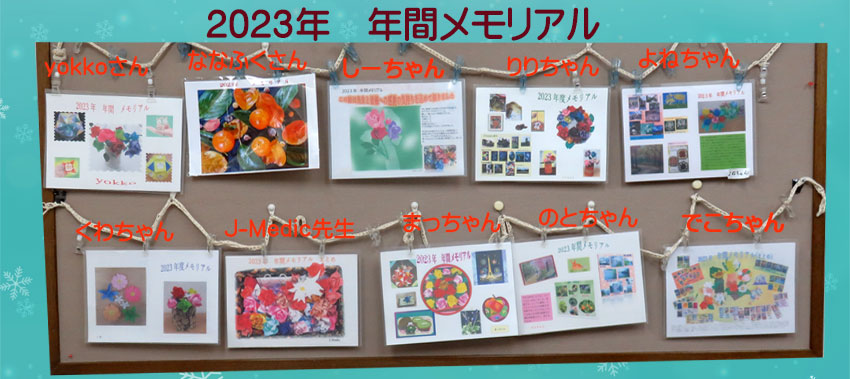 よねちゃん 切り絵のお便り「矢絣に梅」 綺麗にカットされています。でこちゃん お花のざぶとん「鮮緑のダリア」 沢山の花びらで複雑そうです。綺麗な出来上がりですね。yokkoさん マクラメ編み「フクロウ」 難しかったでしょうね。しーちゃん ・クリスタ画「お迎え」:小さい頃の思い出1枚のクリスタ画になりますね。・マクラメ編み「マクラメフラワー」: 青いマクラメフラワー素敵です。のとちゃん かぎ針編み「ベレー帽」 上手に編まれています。まっちゃん 丸シールの風景「カッパドキア」 小さなシールを貼るのが大変だったでしょう。J-Medic先生 かぎ針ざぶとん「プリムラの寄せ植え」、布の彫刻「プティのジュエリートレー 」 ブティは細かい作業で大変です。教えて頂き助かりました。可愛いお花のざぶとんです。 くわちゃん マクラメ編み「ボトルカバー 」「フェザーチャーム」綺麗に編まれています。ななふくさん 羊毛フェルト「柴犬のゴロウちゃん」 バランスがとれていてしっかりとできていて驚きました。