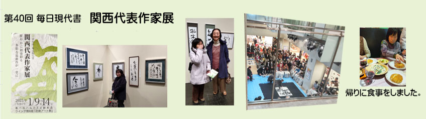 | 2025.01.12 でこちゃんに誘っていただきふくろうさんと3人で、あべのハルカス、ウイング館8階で開催されている「第40回毎日現代書関西代表作家展」行きました。読めない字体が多かったのですが楽しい時間を過ごしました。その後3人で夕食をして帰りました楽しい一日でした。 |