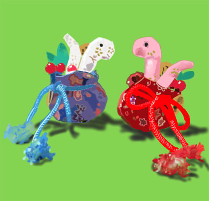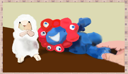 いつも立っているミャクミャク君が横になって休憩している所に甘えん坊シープが遊びに来て仲良くしています。ミャクミャクの足を曲げているところをクリスタ画で描くのが難しかったです。 |