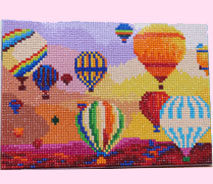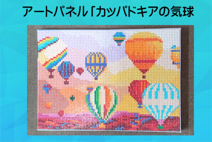 抽選会で頂いた旅行気分で憧れの地を描くアートパネル「カッパドキアの気球」ができました。キャンバスに表記してあるビーズを貼っていきますが表記が小さいのでビーズチャートの表を確認して貼りました。体験させてもらい良かったです。 |