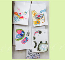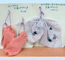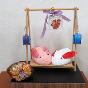 りりちゃん お手玉「ウサギと栗」クロスステッチ「リス」クラフトテープの「ミニランドセル」一番小さいランドセルを作るのが大変でした。 |