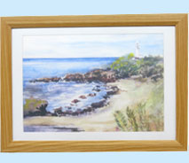 | のとちゃん 風景画「潮の岬」 透明水彩画で描かれています。色を出すのが難しそうですが細かい所まで綺麗に描かれています。 |