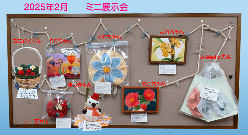 | 2025.02.01 2月のミニ展示会です。今回は、編み物、木目込み、ペーパーフラワー、ビーズ、お直しテクニック作品などが華やかな掲示板になっています。色々な花が咲いた華やかなミニ展示会です。 |