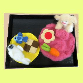 | J-Medic先生 「羊毛フェルトコースター」ニードル針で羊毛を刺していく時指を刺し大変だったそうです。ウサギとアザラシ可愛いですね。 |