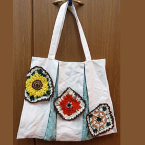 まっちゃん 「かぎ針で編んで咲かせるお花のモチーフ」バックにお花を咲かせるアイデアいいですね華やかです。 |