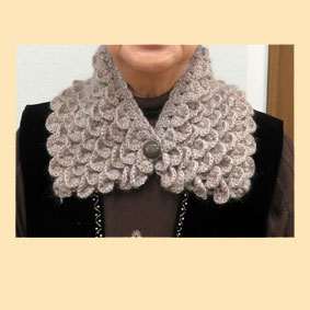 | ななふくさん 「うろこ編みのネックウォーマー」うろこ編みを初めて知りました。ボタンでとめられて暖かそうで素敵ですね。 |