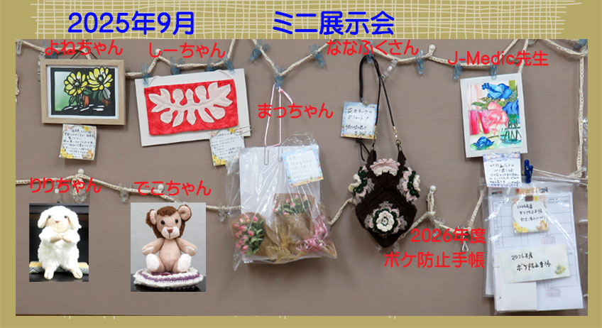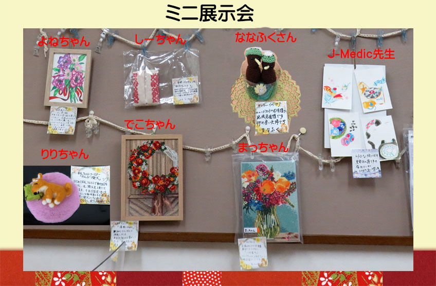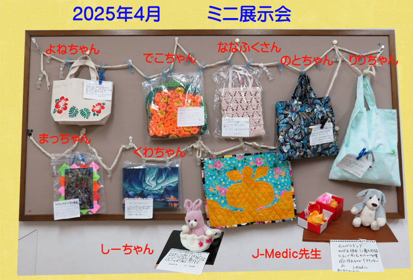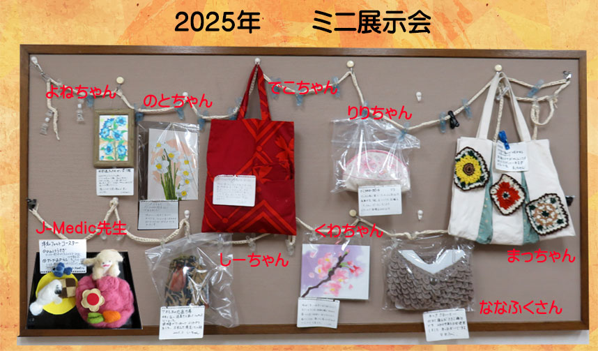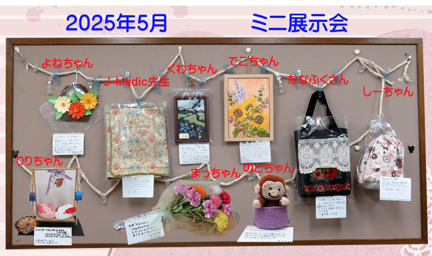 | 2025.05.01 5月のミニ展示会です。カーネーション、ガーベラ、ひまわりなどの花を題材にしたものや布で作った袋物、敷物、帽子や小物、編み物などが展示してあります。 |