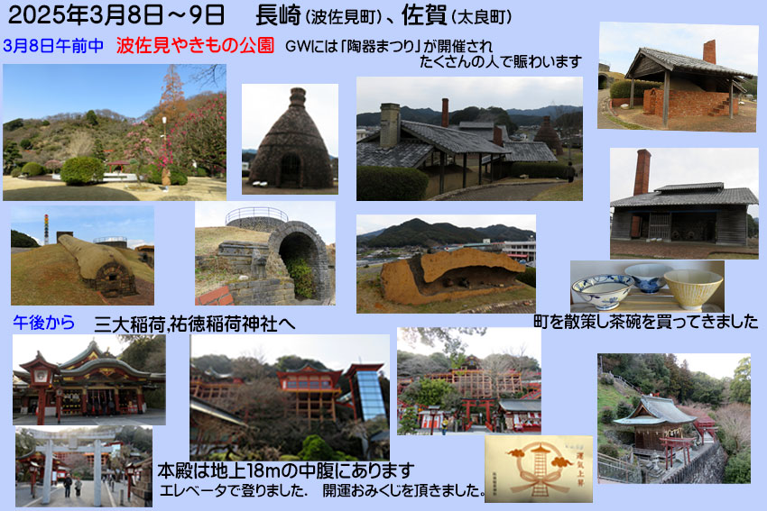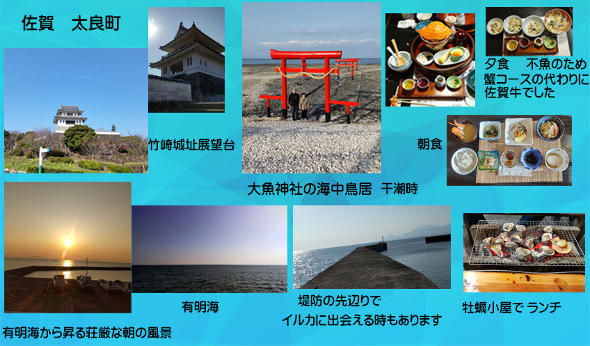 | 2025.03.08~09 家族で有明海に面している佐賀県太良町に一泊することにしました。いつもは私が実家へ一週間ほど前に帰りいその後夫と娘がきて3泊程して帰ります。今回は夫が佐賀「太良町」の竹崎蟹を食べたいと言う希望で宿を予約しました。当日、宿から時化の為蟹コースが佐賀牛に変更と連絡ありキャンセル可能でしたが行くことにしました(夫はとても残念そうにしていました)。一日目は焼き物で有名な波佐見町に寄り、散策しました。波佐見焼はシンプルでありながら美しいデザインと高い耐久性の焼き物です。ゴールデンウィークには「陶器まつり」がありたくさんの人で賑わいます。各自のご飯茶碗をかいました。温泉地の嬉野の町を通り祐徳稲荷神社にいきお参りしました。太良町には大魚神社の3基の海中鳥居があり人気撮影スポットになっているようです。竹崎城址展望台で美しい景色をみて宿へ向かいました。有明海を一望できる宿に着きました。先にお風呂に入り休憩しました楽しみの夕食の時間です。佐賀牛とオリジナル料理「かにまぶし」(かにまぶし飯、蟹茶わん蒸、刺身、デザート)など美味しいお料理がでました、「竹崎カニ」(ワタリガニとして知られているものです)は食べられませんでしたが夫は満足していました。夜の8時頃から宿の前で きらめく星空専門家の解説で星空観察をし星も堪能しました。九州四県を見渡すこともできる所でした。翌朝