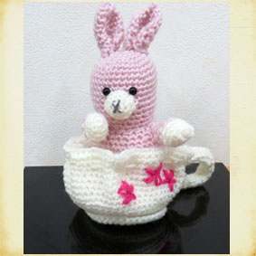 しーちゃん 手のひらサイズの動物の編みぐるみ、こま編みで編まれてます。カップの持ち手が難しかったそうです。とても可愛いですね。 |