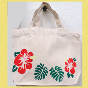 | よねちゃん 「ステンシルの布バック」、宮古島で見られたハイビスカスの花を布バックにステンシルで色付けされています。華やかなになりましたね。 |