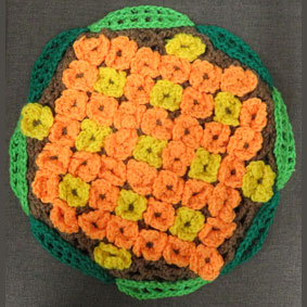 しーちゃん かぎ針編みの花ざぶとんおしりポカポカふんわり優しい座布団暖かいでしょうね。丁寧に編まれています。 |