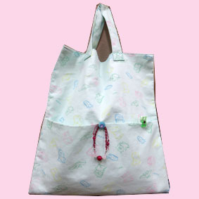| のとちゃん ランチョンマットとおりたたんでサイドを縫ったバック、でこちゃんの作品を参考にされたバック、柄もよくて綺麗にできてますね。 |