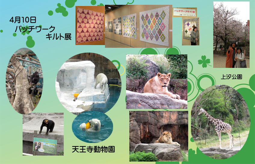 大阪国際交流センターで開催かれているパッチワークキルト展に誘っていただきでこちゃんとふくろうさんと一緒に行きました。交流センター横の公園で満開の桜の下で休憩しました。その後バスで天王寺動物園に行きました。工事中でしたが久しぶりの動物園で動物達に癒されました。食事をしてかえりました楽しい一日でした。 |