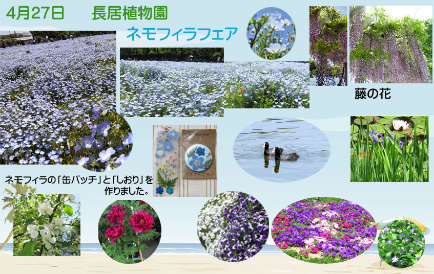 ネモフィラのドライフラワーを使って缶バッチ、しおり、せっけんを作るコーナーがあったので私は「しおり」娘「缶バッチ」にチャレンジし可愛いいのができました。暖かくなっていろいろな花が咲いていました。楽しい一日でした。 |