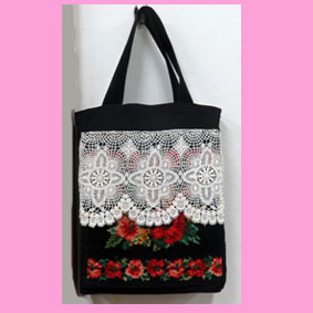 | ななふくさん お手軽バック花柄の綺麗な布にレースを付けて再利用されてます。ポケットになっていて便利ですね。お出かけが楽しみですね。 |