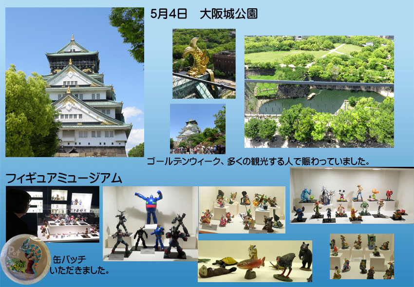 ゴールデンウィークに娘と大阪城公園に行きました。お天気も良く海外の団体旅行の方が多く賑わっていました。大阪城天守閣のいろいろな展示品をみてきました。近くの「ミライザ大阪城」でフィギュアミュージアムがありましたのでみてきました。フィギュアが沢山展示してあり懐かしいく昔を思い出しました。 |