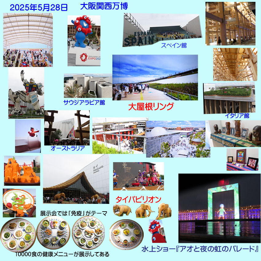 | 2025.05.28 関西万博に友達4にんで行きました。スマホでの予約をしたことがないので娘に教えてもらいながらチケットをとりました。パピリオンは「タイ」と水上ショーの「アオと夜の虹のパレード」がとれました。娘は4人で行くことができるか心配して「EXPO2025デジタルチケット」を4枚印刷してくれました。別行動ができるので疲れたら休憩していたらいいよと言いました。当日、11時東ゲートで荷物のチケットを受けました(私はキャスター付きの横押しカートを持っていたのでカートが必要な理由など聞かれて写真を撮られて無事に通過できました。)。パビリオンの付近はたくさんの人でした。最初に大屋根リングにエレベータで上がると色とりどりの花が咲いていました。会場を一望できました。次は大屋根リングの下をゆっくりと歩いたり休憩したりしました。予約したタイパビリオンに行って沢山の展示してあるのをみました、外にもありました。7時半からの水上ショー「アオと夜の虹のパレード」に行きました。ひとりの子ども「アオ」が夜の虹と出会い生きもの達と交わり心を通わせていく物語です。照明などが素晴らしいと思いました。疲れましたが万博の雰囲気を味わうことができ良かったです。 |