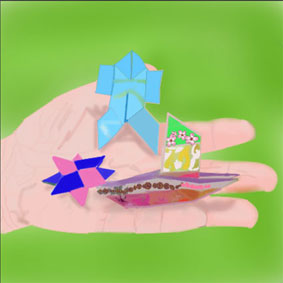 今回は、袴をはかせた奴さんとダブルの手裏剣、だまし船を先生にお借りして手のひらにのせてクリスタ画で描きました。折紙の模様は描きにくかったです。メンバーページ更新の為に4回続けて手を描きましたが難しいです。 |