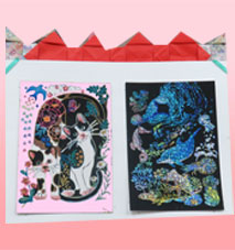 まっちゃん スクラッチアート「季節の花と動物たち」 細かい所まできれいに削ってありますね。角度を変えるといろいろみえてきて素敵ですね。 |