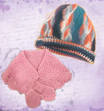 帽子はストレッチ編みの木の葉模様で編みました。ミニショールは通す所があるので便利だと思います。 |