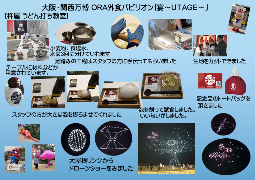 | 2025.07.03 家族3人で大阪万博に行きました。午後1時にORA外食パビリオン『宴~utage~』で大阪の老舗「杵屋」が開催している手打ちうどん教室を予約していたので参加しました。小麦粉に塩水を複数回に分け入れて混ぜ合わせた生地をビニール袋に入れ足で踏む今度は棒で伸ばす。次は職人さんに手伝ってもらいカットして完成です。「杵屋」が提案する次世代うどんを試食しました(作ったうどんではありません)とても美味しかったです。教室認定証、トートバッグをいただきました。教えていただいた職人のお話は楽しく、スタッフの方は親切で体験に参加できて良かったです。最後に大屋根リングからドローンショーをみて帰りました。 |