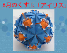 8月のくす玉は「アイリス」です。ブルーとオレンジの2色で作りました。クルクルと巻いてカールをつけるのが大変でしたが可愛いくす玉ができました。。 |
