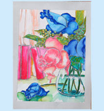 よねちゃん 水彩画タッチのペン塗り絵大きな3つの花は濃ゆかったので削って再度塗られています。薄いペンで丁寧に塗られています。 |