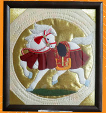 | でこちゃん パッチワーク 来年の干支『午」押絵を図案化しパッチワークようにアレンジされたそうです。時間がかかり大変だったでしょうね。 |