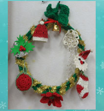 ななふくさん クリスマスリースハンガーに手編みの小さいサンタクロース、靴下、帽子、ポインセチアなどのオーナメントを作られて飾られた素敵なリースです。 |